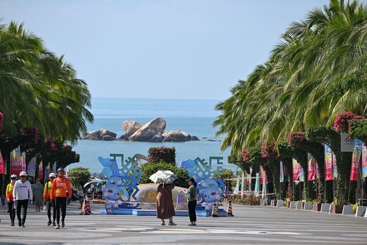 2024年11月19日,游客從位于三亞天涯海角游覽區(qū)的運(yùn)動(dòng)會(huì)吉祥物前經(jīng)過。新華社記者 陳澤國 攝