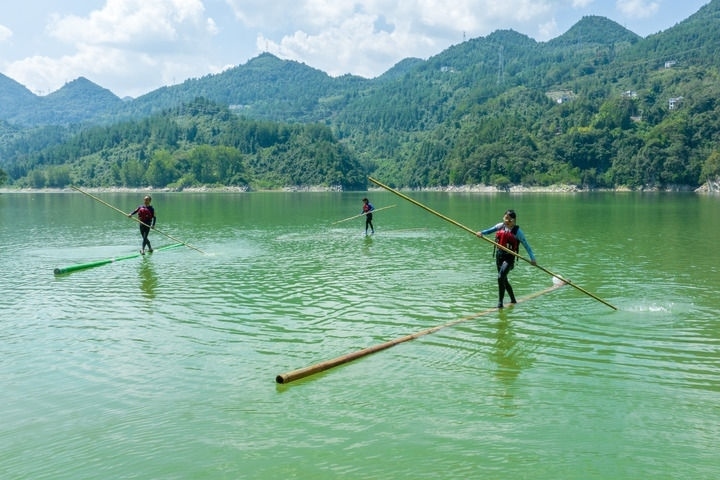 2023年9月15日,愛好者在湖北宣恩雙龍湖上練習(xí)“獨(dú)竹漂”(無人機(jī)照片)。新華社發(fā)(王法鈞攝)