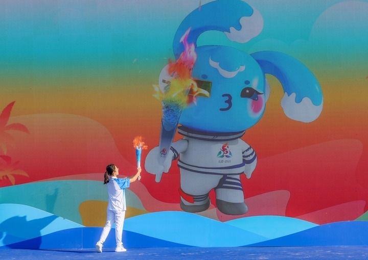 2024年11月17日,火炬手韓曉燕在三亞進(jìn)行的火炬實(shí)地傳遞活動(dòng)起跑儀式上與本屆運(yùn)動(dòng)會(huì)吉祥物“吉貝”對(duì)接,點(diǎn)燃火炬。新華社記者 陳朔 攝