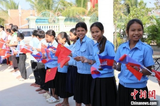 1月19日,“絲路心相通”春節(jié)文化交流活動在茶膠省中柬友好扶貧示范村達(dá)弄村活動中心舉辦,學(xué)生們在道路旁舉旗歡迎。項(xiàng)薪宇 攝
