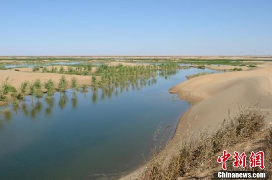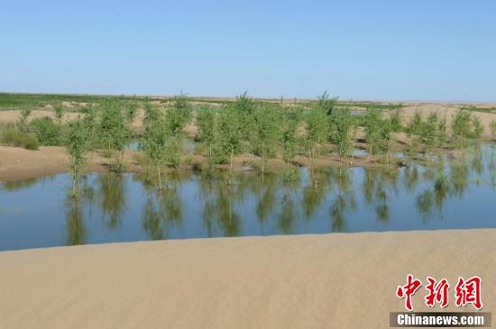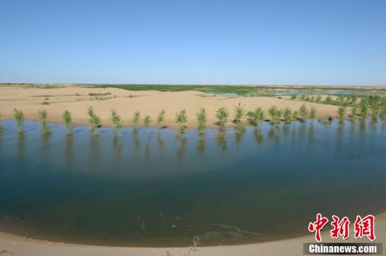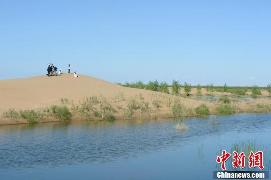 7月24日,引自黃河的凌水讓沙漠上充滿生機。據(jù)悉,中國第七大沙漠--庫布齊沙漠所處的杭錦旗境內(nèi),每年過境水量310億立方米,當(dāng)?shù)匾荒耆忠坏臅r間都是凌汛期。政府因地制宜,2016年投資建成分凌引水渠、生態(tài)圍堤等設(shè)施,自2016年至2018年黃河凌汛期以來,累計分凌5千余萬立方米,形成約36平方公里保護濕地的面積,原來為沙漠的地貌逐漸變成綠洲,農(nóng)牧民開始發(fā)展野牛養(yǎng)殖與農(nóng)家樂旅游業(yè)。中新社記者劉文華攝