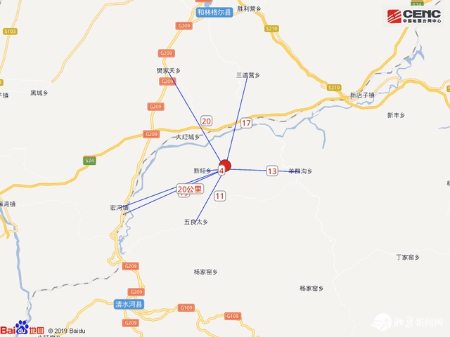 震中距和林格爾縣27公里、距清水河縣29公里、距山西右玉縣55公里、距托克托縣58公里、距準格爾旗60公里,距呼和浩特市76公里。