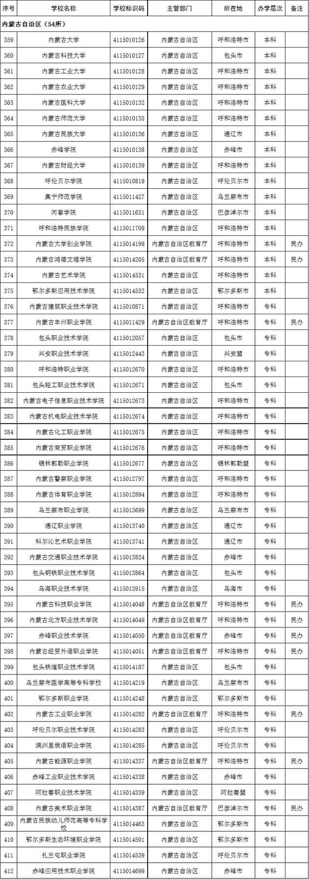 截至2020年6月30日,全國(guó)高等學(xué)校共計(jì)3005所,其中:普通高等學(xué)校2740所,含本科院校1258所、高職(??疲┰盒?482所;成人高等學(xué)校265所。本名單未包含港澳臺(tái)地區(qū)高等學(xué)校。以下為內(nèi)蒙古自治區(qū)2020年普通高等學(xué)校名單(54所)。