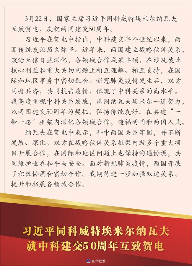 新華社北京3月22日電 3月22日,國家主席習(xí)近平同科威特埃米爾納瓦夫互致賀電,慶祝兩國建交50周年。