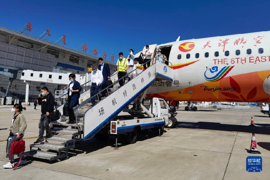 旅客乘坐航班從呼和浩特抵達錫林浩特機場。新華社記者李云平攝