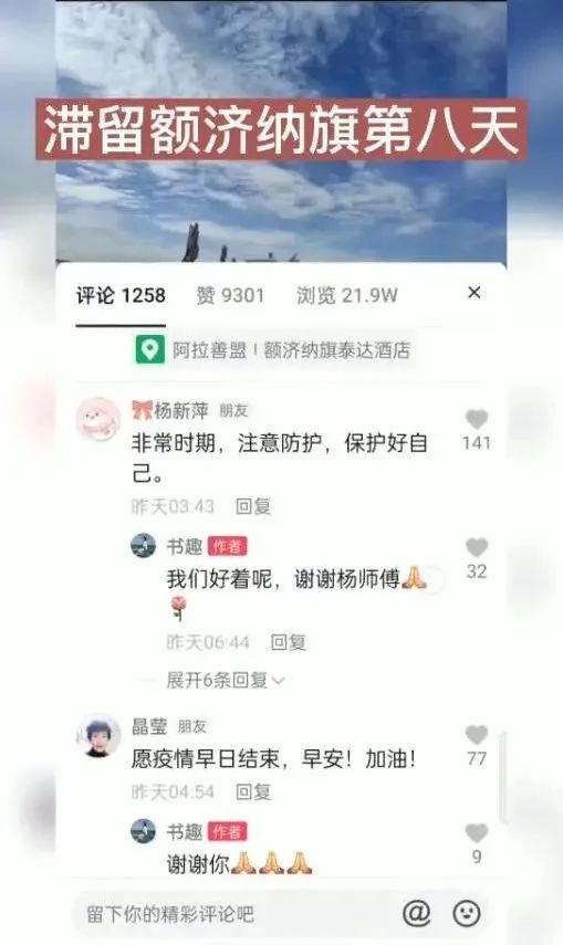 視頻發(fā)出數(shù)小時就吸引了上萬的瀏覽量。視頻發(fā)布者王女士在視頻中呈現(xiàn)一家人滯留額濟納旗現(xiàn)況的同時,也給和她同樣滯留額濟納旗的近萬名游客鼓勁:“如果你此時正在阿拉善,愿你如胡楊般堅強,積極應對疫情。”