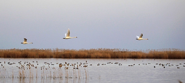蘆葦蕩漾,鴻雁飛翔。此刻,鳥類攝影愛好者馬海明扛起他的相機(jī),駕著破冰艇駛向?yàn)趿核睾5纳钐?。他平靜地說:“再過些日子,這里的鳥更多、魚更歡,拍出來的照片會(huì)更美更精彩?!?/p>