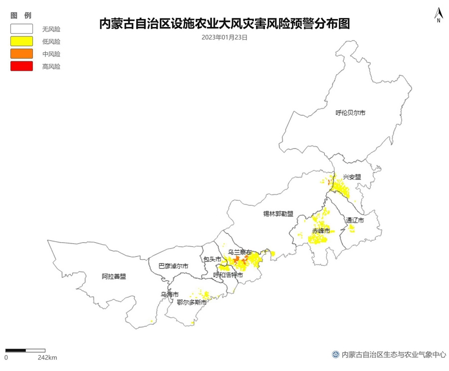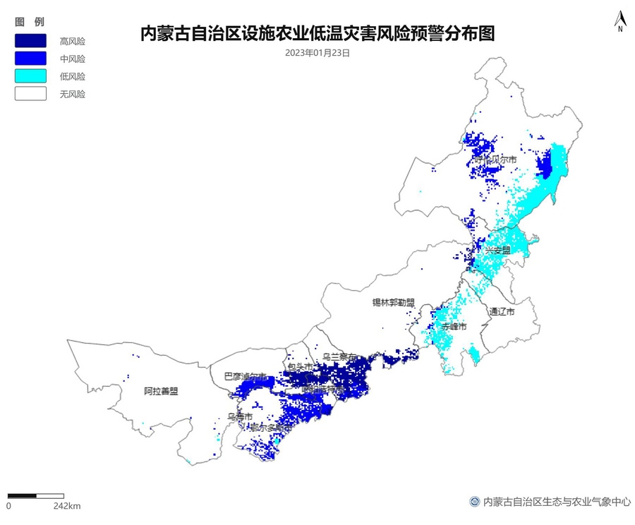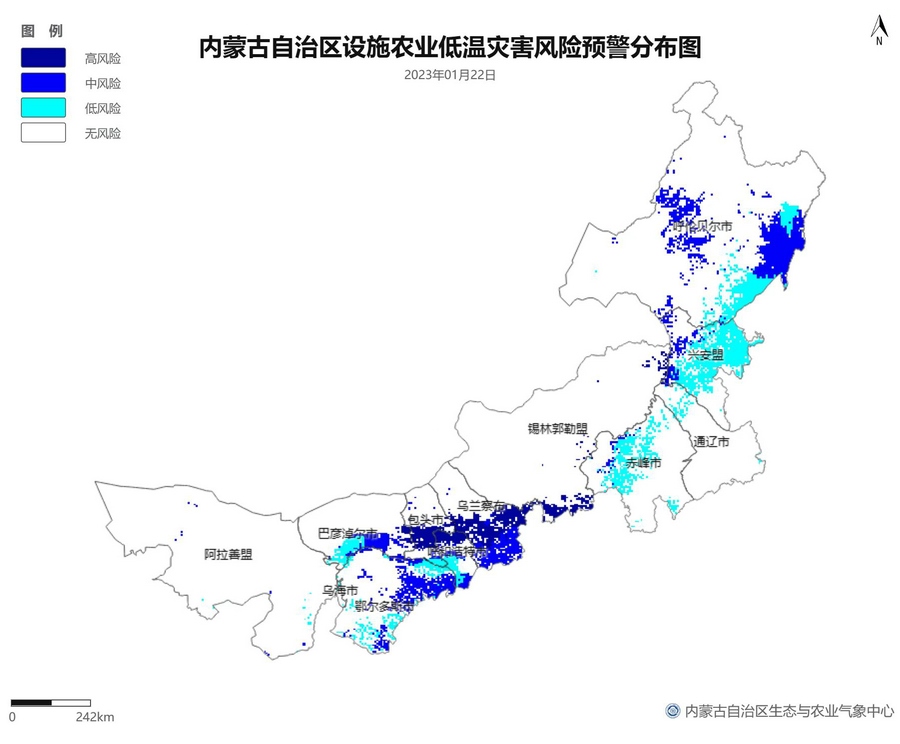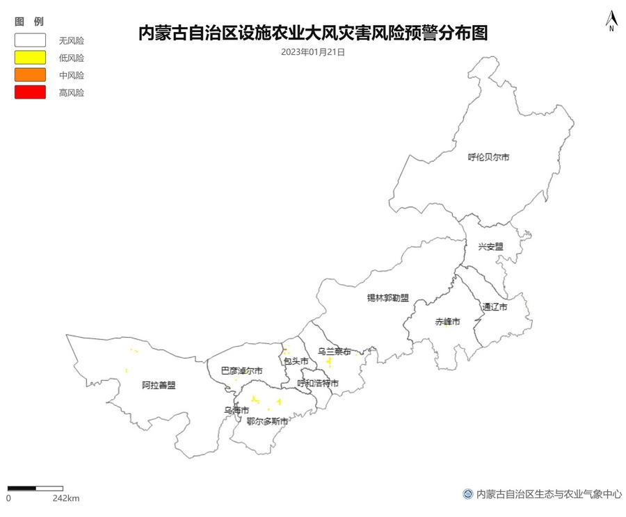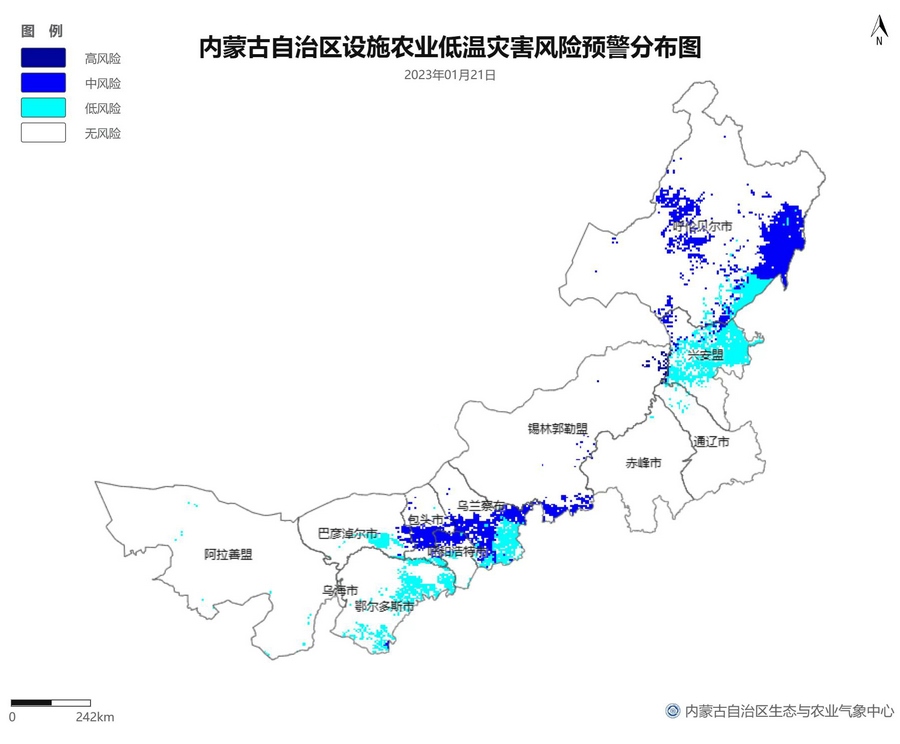 根據(jù)智能網(wǎng)格預(yù)報數(shù)據(jù),結(jié)合設(shè)施農(nóng)業(yè)低溫災(zāi)害和風(fēng)災(zāi)指標(biāo),1月21日至23日,呼倫貝爾市東南部、東南部偏西地區(qū)為設(shè)施農(nóng)業(yè)低溫災(zāi)害低風(fēng)險地區(qū),東北部中部及東部、中部偏南大部、西部偏東部分地區(qū)為設(shè)施農(nóng)業(yè)低溫災(zāi)害中或高風(fēng)險地區(qū),低溫災(zāi)害將導(dǎo)致作物生長緩慢和受凍;21至23日,東南部部分地區(qū)、中部偏西南局部地區(qū)及鄂爾多斯市零星地區(qū)為設(shè)施農(nóng)業(yè)風(fēng)災(zāi)低風(fēng)險地區(qū),其中,22日鄂爾多斯市北部零星地區(qū)、23日錫林郭勒盟東部零星地區(qū)、烏蘭察布市中部局部地區(qū)為設(shè)施農(nóng)業(yè)風(fēng)災(zāi)中或高風(fēng)險地區(qū),風(fēng)災(zāi)易造成溫室結(jié)構(gòu)受損。