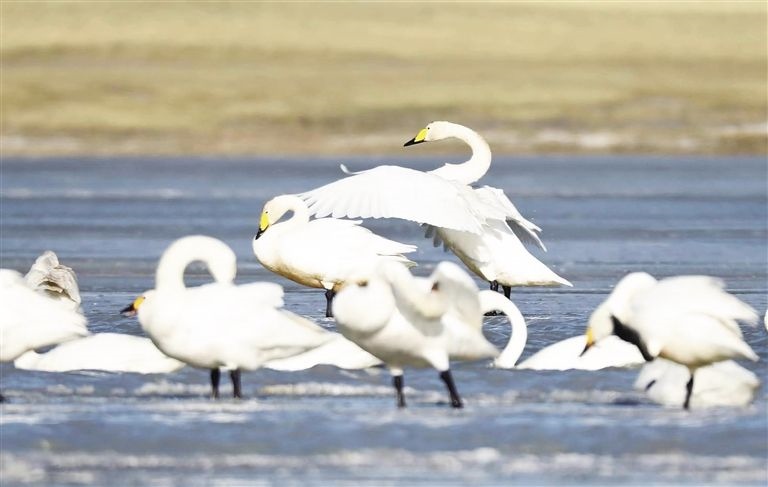 天氣漸暖,晶晶和盈盈準(zhǔn)備北遷。這幾天,它倆每天都在洞庭湖上練習(xí)起飛、降落、滑行,為即將開始的長(zhǎng)途旅行做“熱身”準(zhǔn)備。