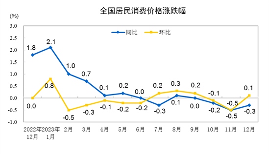 2023年12月份,全國居民消費(fèi)價(jià)格同比下降0.3%。其中,城市下降0.3%,農(nóng)村下降0.5%;食品價(jià)格下降3.7%,非食品價(jià)格上漲0.5%;消費(fèi)品價(jià)格下降1.1%,服務(wù)價(jià)格上漲1.0%。