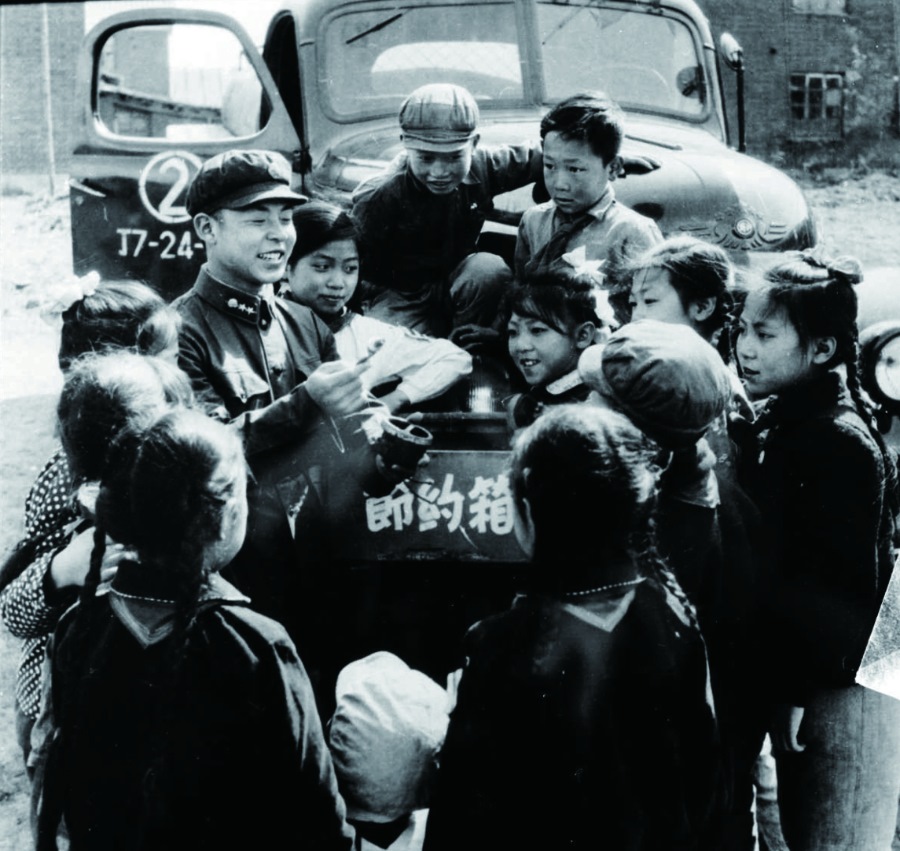 ↑雷鋒被聘為某小學的校外輔導員,他教育孩子們不要忘記艱苦奮斗的光榮傳統(tǒng)。