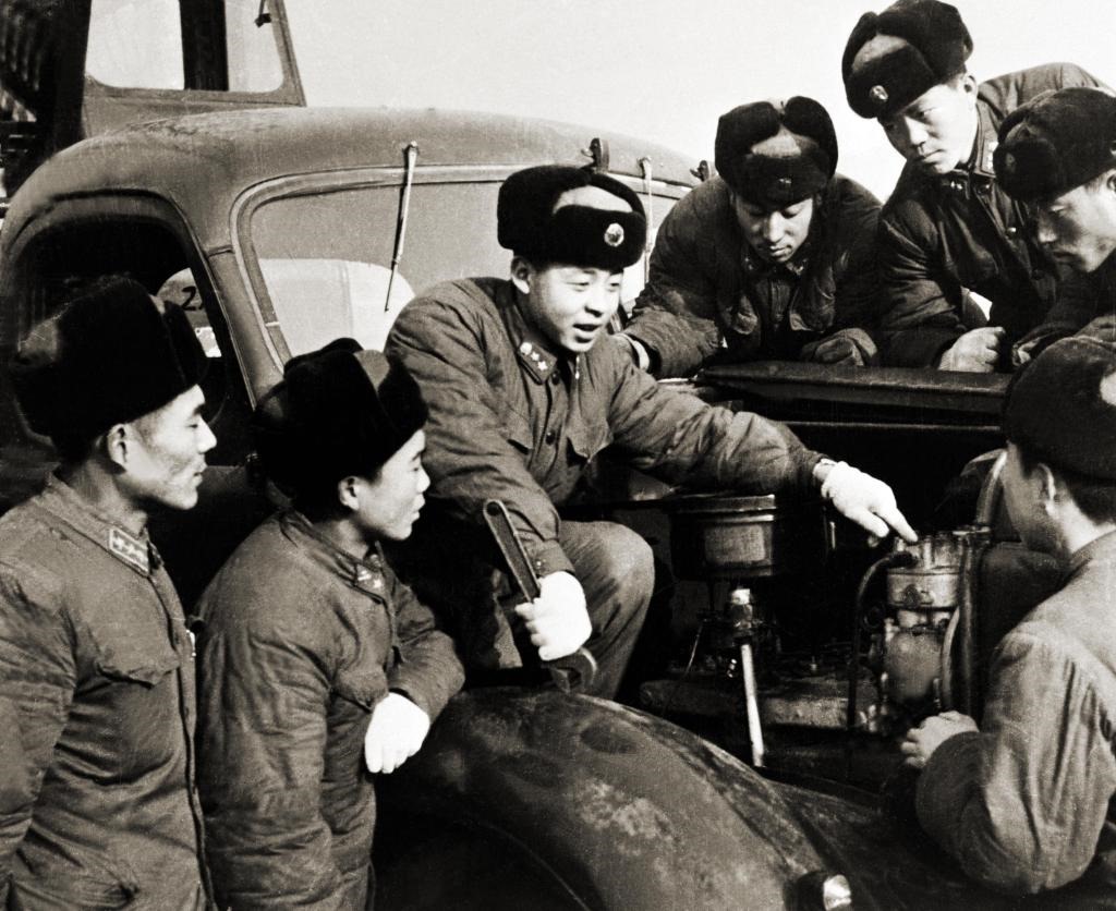 ↑雷鋒(左三)在向戰(zhàn)友們介紹節(jié)油經驗。