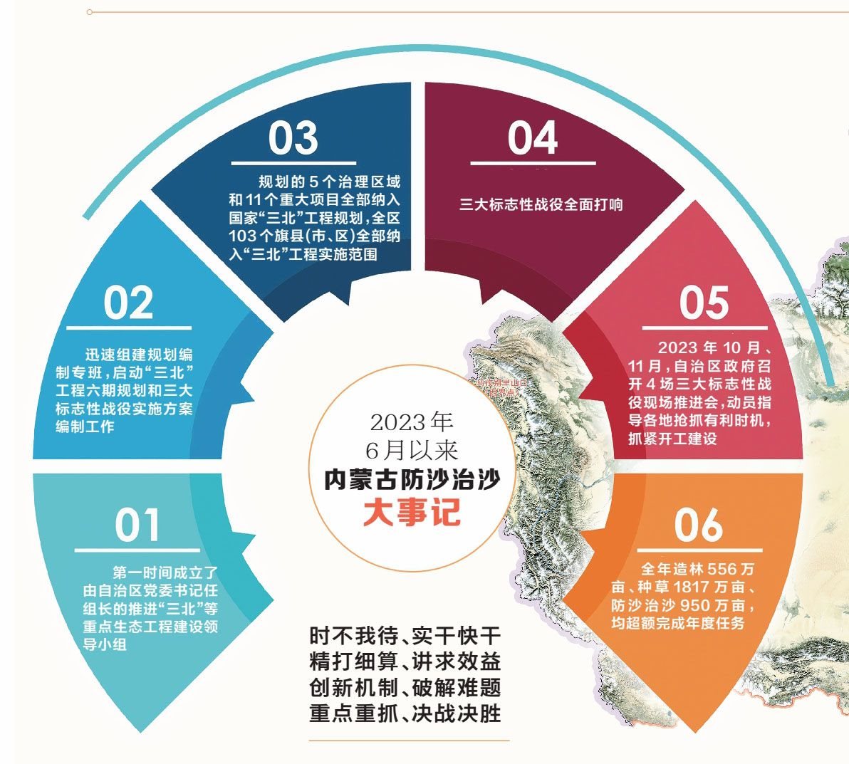 7月底,鄂爾多斯市率先打響黃河“幾字彎”攻堅戰(zhàn);8月12日,赤峰市打響科爾沁、渾善達(dá)克兩大沙地殲滅戰(zhàn)“第一槍”;11月初,自治區(qū)打響河西走廊—塔克拉瑪干沙漠邊緣阻擊戰(zhàn)。