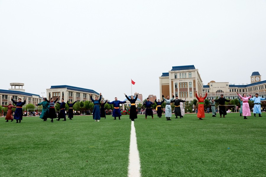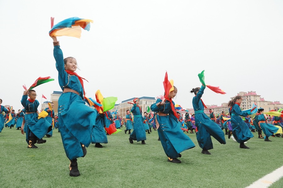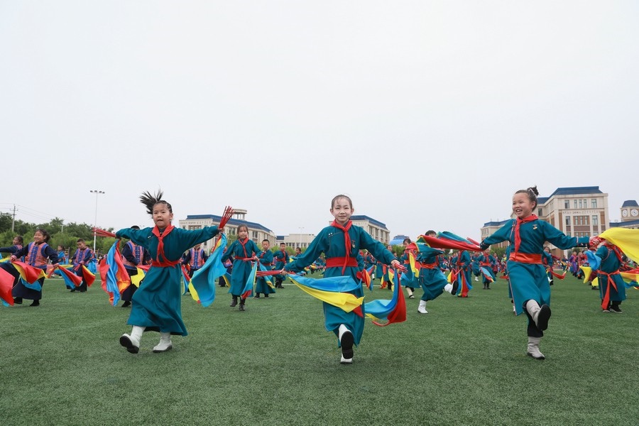 北疆新聞鄂爾多斯5月29日電(記者 張楊)“我們以鑄牢中華民族共同體意識為主線,創(chuàng)建了4個‘千人文化’特色課程,分別為千人足球、千人《江格爾》、千人筷子舞、千人棋類?!?月29日,內(nèi)蒙古鄂爾多斯鄂托克前旗“美育潤心·筑夢同行”第十四屆中小學師生藝術(shù)節(jié)暨慶“六一”國際兒童節(jié)多彩大課間操展示活動,在鄂托克前旗第一小學舉行。該校校長阿拉騰達來接受記者采訪時表示,創(chuàng)建這個特色課程的主要目的,是培養(yǎng)孩子多方面的才藝,為祖國培養(yǎng)有用之才。