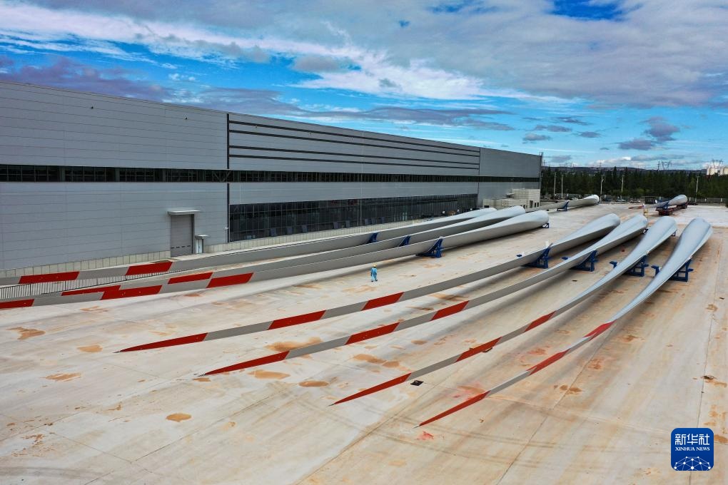 ??這是9月20日拍攝的位于鄂爾多斯市的株洲時代新材料科技股份有限公司蒙西分公司內(nèi)的風機葉片(無人機照片)。