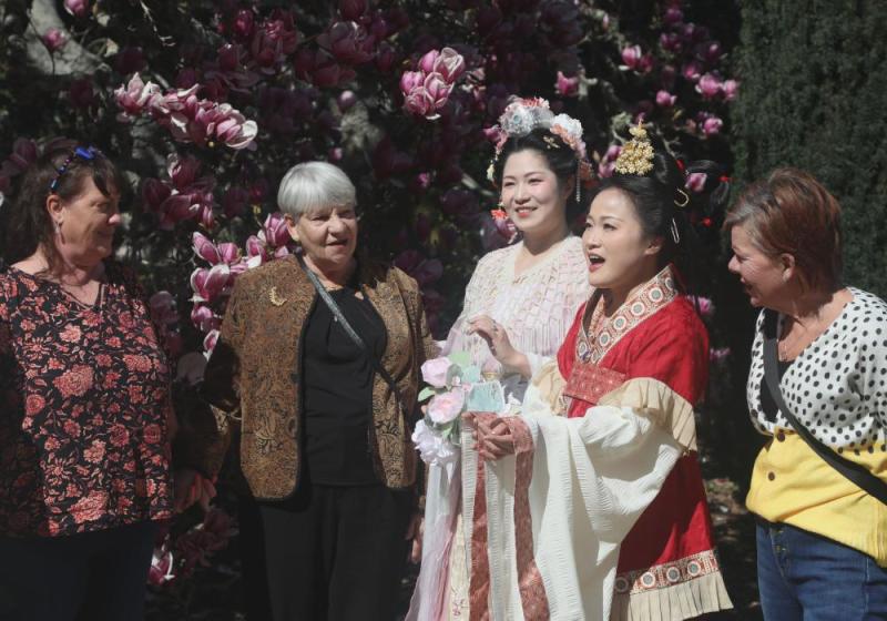 2025年3月1日,在美國伍德賽德的斐洛里莊園,漢服愛好者與游客在花朝節(jié)慶?;顒由辖涣鳌P氯A社發(fā) 劉藝霖 攝