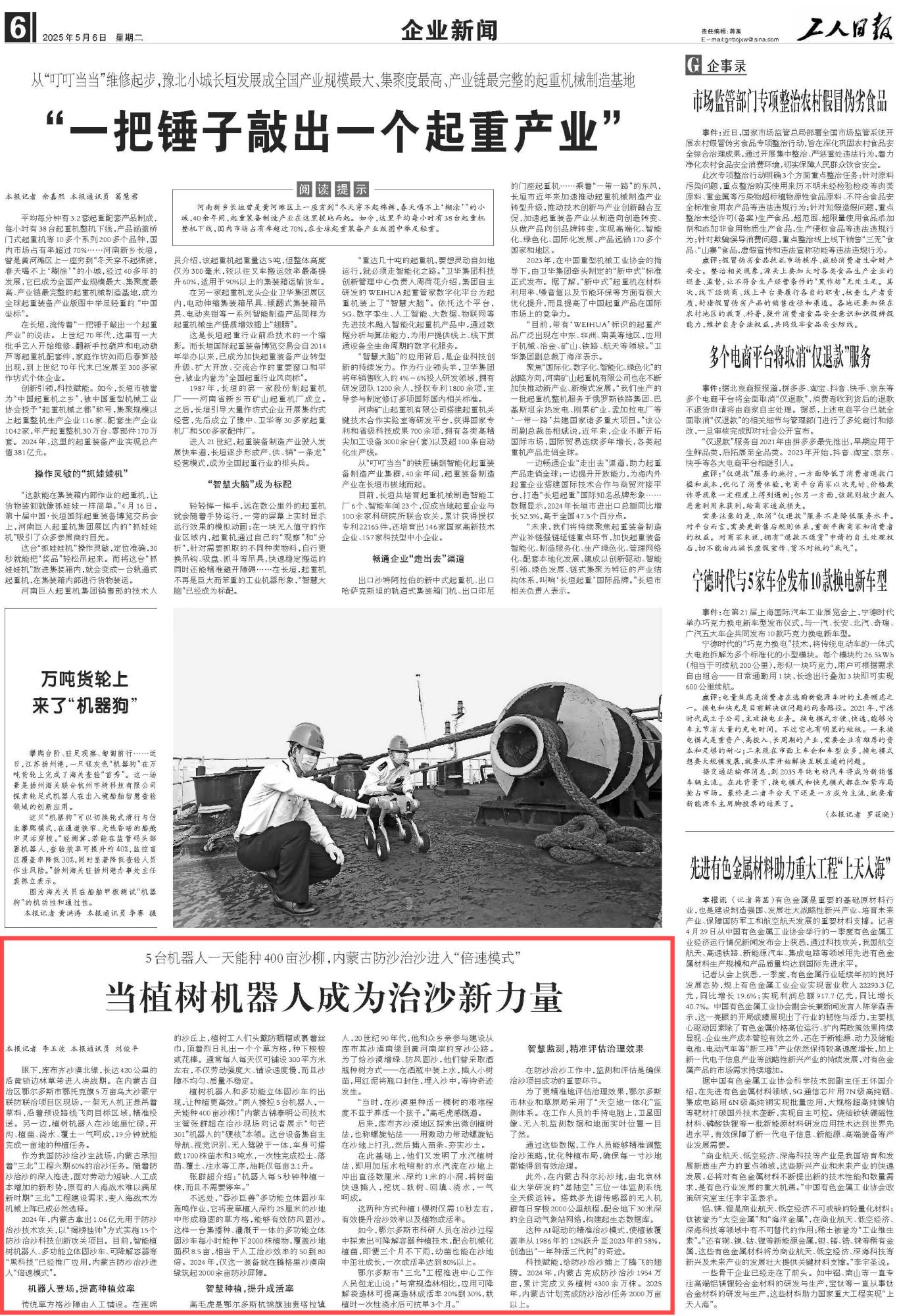 2025年5月6日,《工人日報》第6版刊發(fā)題為《當(dāng)植樹機(jī)器人成為治沙新力量》的文章,報道了內(nèi)蒙古作為我國防沙治沙主戰(zhàn)場,承擔(dān)著“三北”工程六期60%的治沙任務(wù)。隨著防沙治沙的深入推進(jìn),智能植樹機(jī)器人、多功能立體固沙車、可降解容器等“黑科技”已經(jīng)推廣應(yīng)用,內(nèi)蒙古防沙治沙進(jìn)入“倍速模式”。