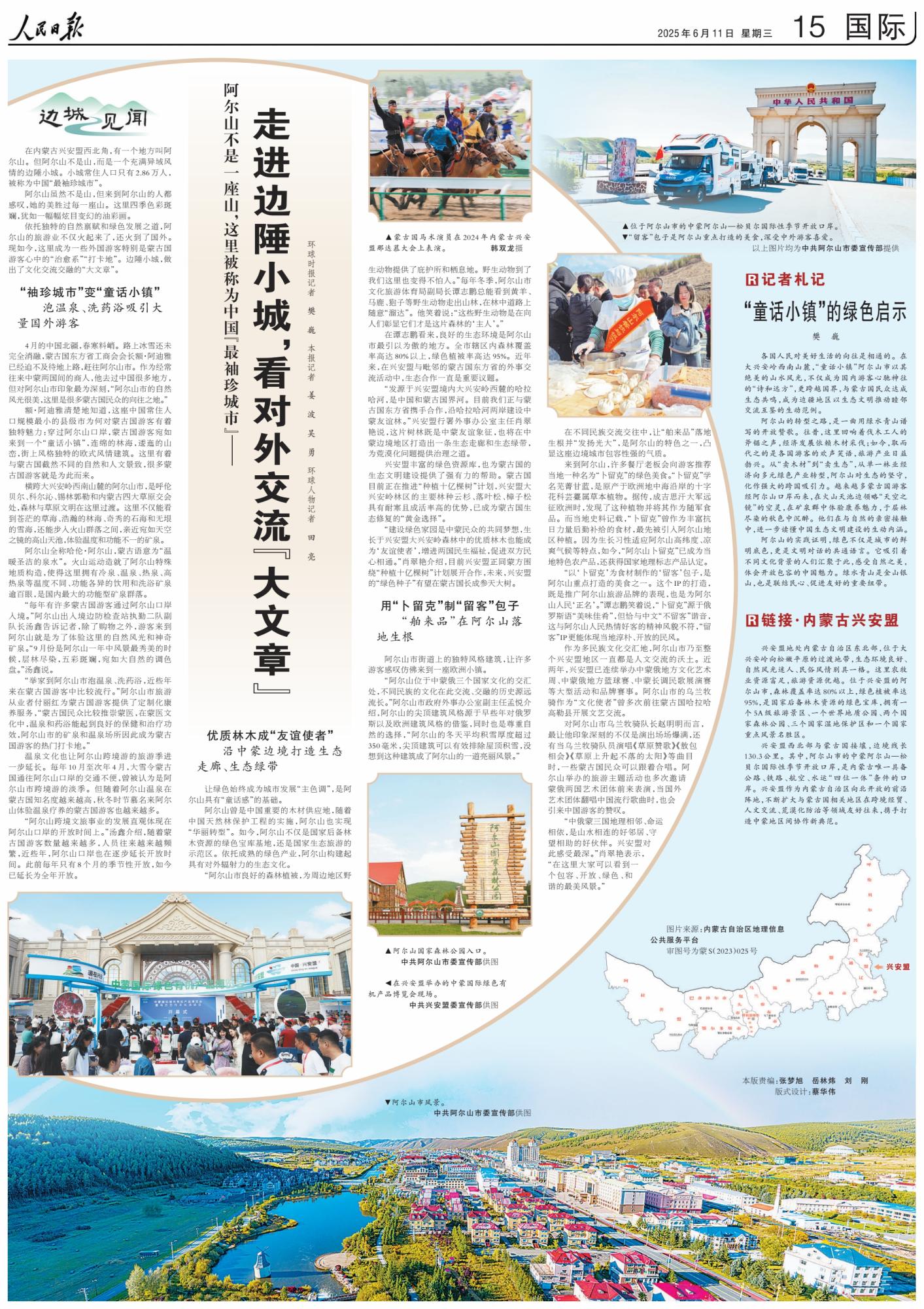 2025年6月11日,《人民日?qǐng)?bào)》第15版刊發(fā)整版文章《阿爾山不是一座山,這里被稱為中國(guó)“最袖珍城市”——走進(jìn)邊陲小城,看對(duì)外交流“大文章”》,報(bào)道了依托獨(dú)特的自然稟賦和綠色發(fā)展之道,阿爾山的旅游業(yè)火起來(lái)了。現(xiàn)如今,這里成為一些外國(guó)游客特別是蒙古國(guó)游客心中的“治愈系”“打卡地”。邊陲小城,做出了文化交流交融的“大文章”。
