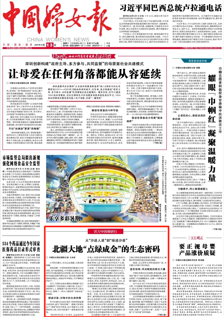 2025年8月13日,《中國婦女報》第1版刊發(fā)題為《從“沙進人退”到“綠進沙退” 北疆大地“點綠成金”的生態(tài)密碼》的文章,報道了“活力中國調研行”采訪團深入內蒙古大地,在這片廣袤的熱土上,新能源產業(yè)與防沙治沙工程交織共生,奏響了一曲令人振奮的“點綠成金”協(xié)奏曲。