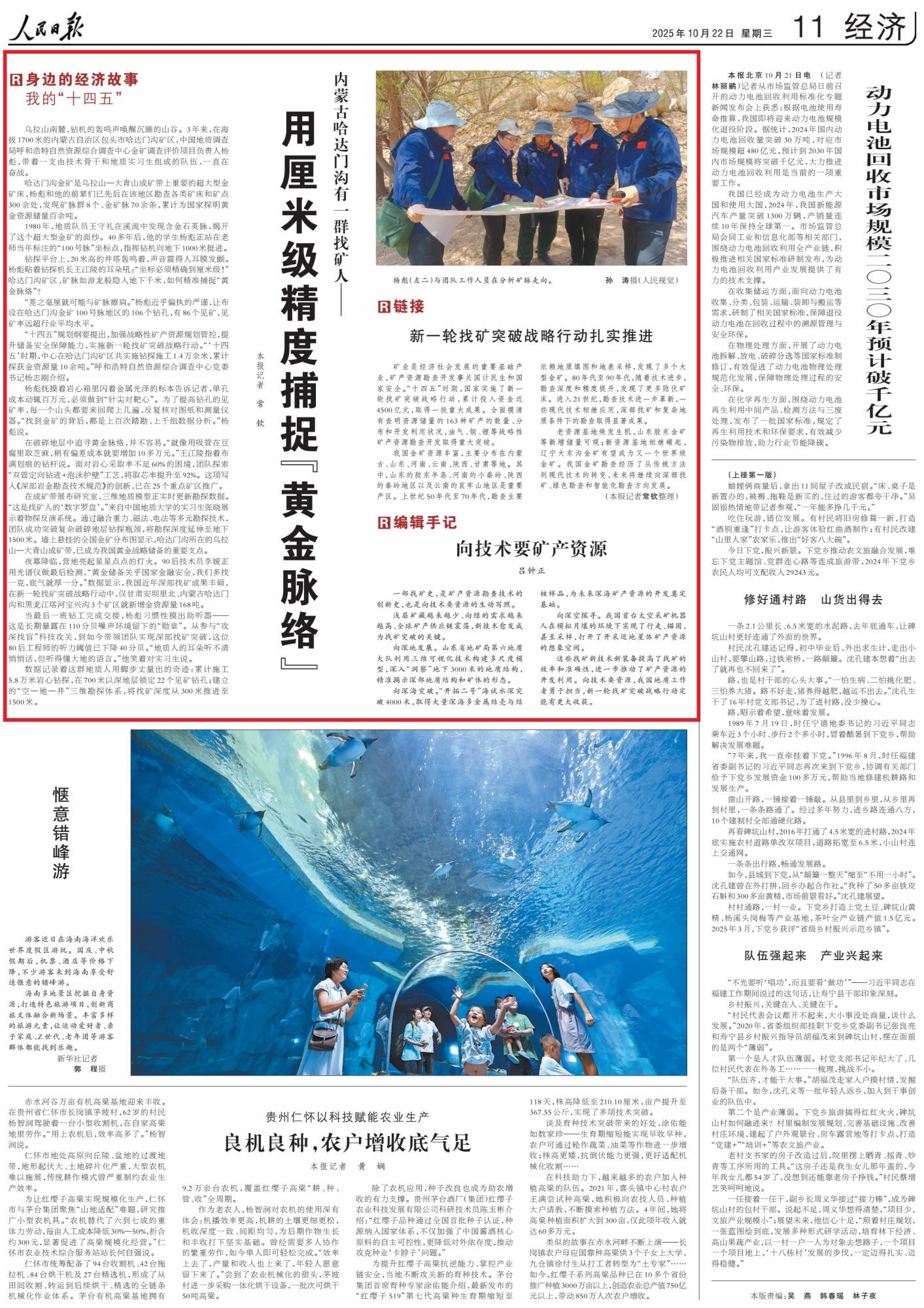 2025年10月22日,《人民日報》第11版刊發(fā)題為《內(nèi)蒙古哈達門溝有一群找礦人——用厘米級精度捕捉“黃金脈絡”》的文章,報道了中國地質(zhì)調(diào)查局楊彪團隊在內(nèi)蒙古哈達門溝礦區(qū)奮戰(zhàn)3年,依托前輩基礎(chǔ),累計探明黃金百余噸,“十四五”期間新增10余噸,鉆孔見礦率超行業(yè)平均。