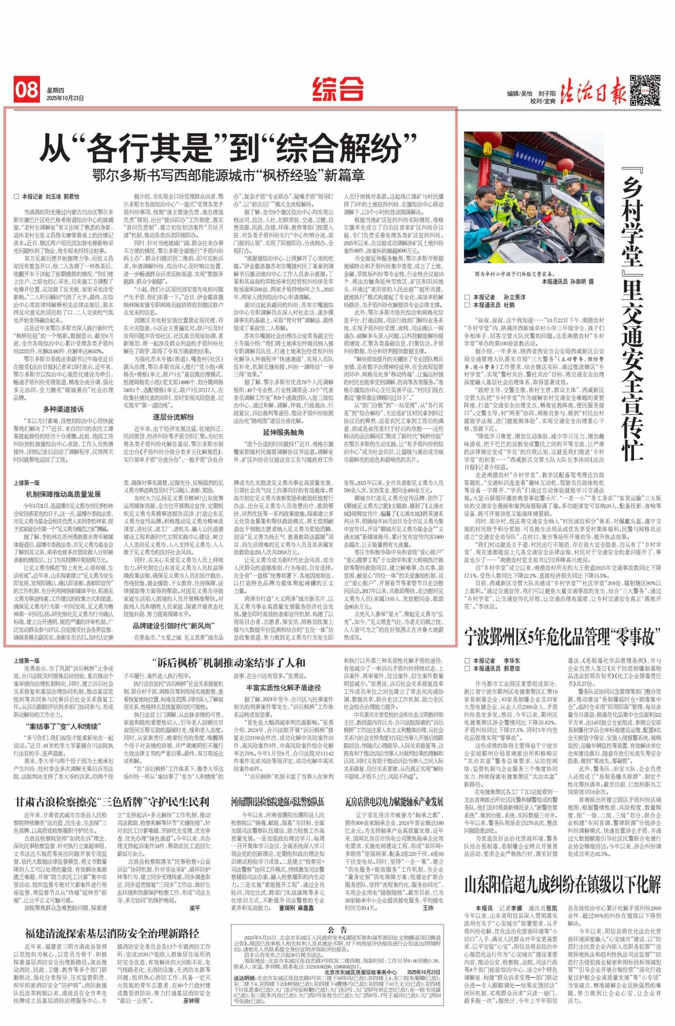 2025年10月23日,《法治日報》第8版刊發(fā)題為《從“各行其是”到“綜合解紛”鄂爾多斯書寫西部能源城市“楓橋經驗”新篇章》的文章,報道了鄂爾多斯市以綜治中心規(guī)范化建設為核心,深入踐行新時代“楓橋經驗”,通過多元舉措化解矛盾糾紛,全力打造“暖城善治”社會治理品牌。截至9月底,全市各級綜治中心累計受理各類矛盾糾紛22371件,化解率達96.03%。