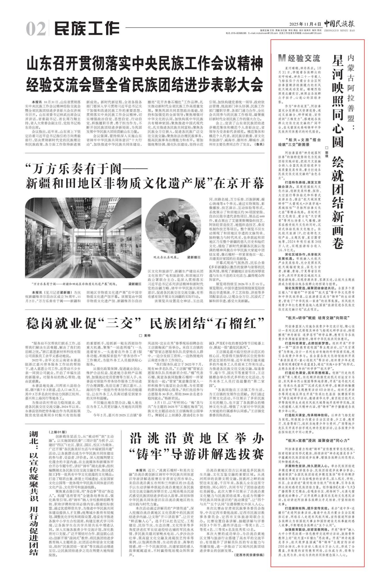 2025年11月4日,《中國民族報》第2版刊發(fā)題為《內(nèi)蒙古阿拉善盟:星河映照同心圓 繪就團結(jié)新畫卷》的文章,報道了伴隨著各族群眾的歡呼吶喊,神舟二十一號載人飛船在位于內(nèi)蒙古自治區(qū)阿拉善盟額濟納旗境內(nèi)的東風(fēng)航天城成功發(fā)射。璀璨烈焰照亮北疆夜空,映照出各族群眾手拉手、心連心的團結(jié)身影。