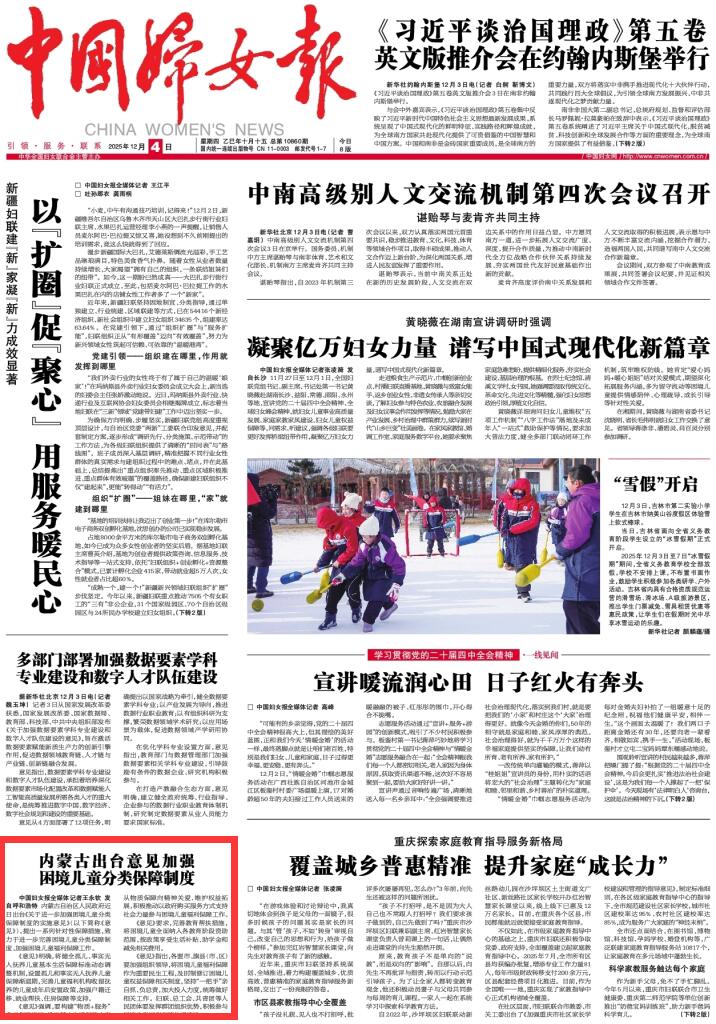 2025年12月4日《中國婦女報》第1版刊發(fā)了《內蒙古出臺意見加強困境兒童分類保障制度》的文章,報道了內蒙古自治區(qū)人民政府近日出臺《關于進一步加強困境兒童分類保障制度的實施意見》,提出一系列針對性保障措施,致力于進一步完善困境兒童分類保障制度,加強困境兒童福利保障工作。