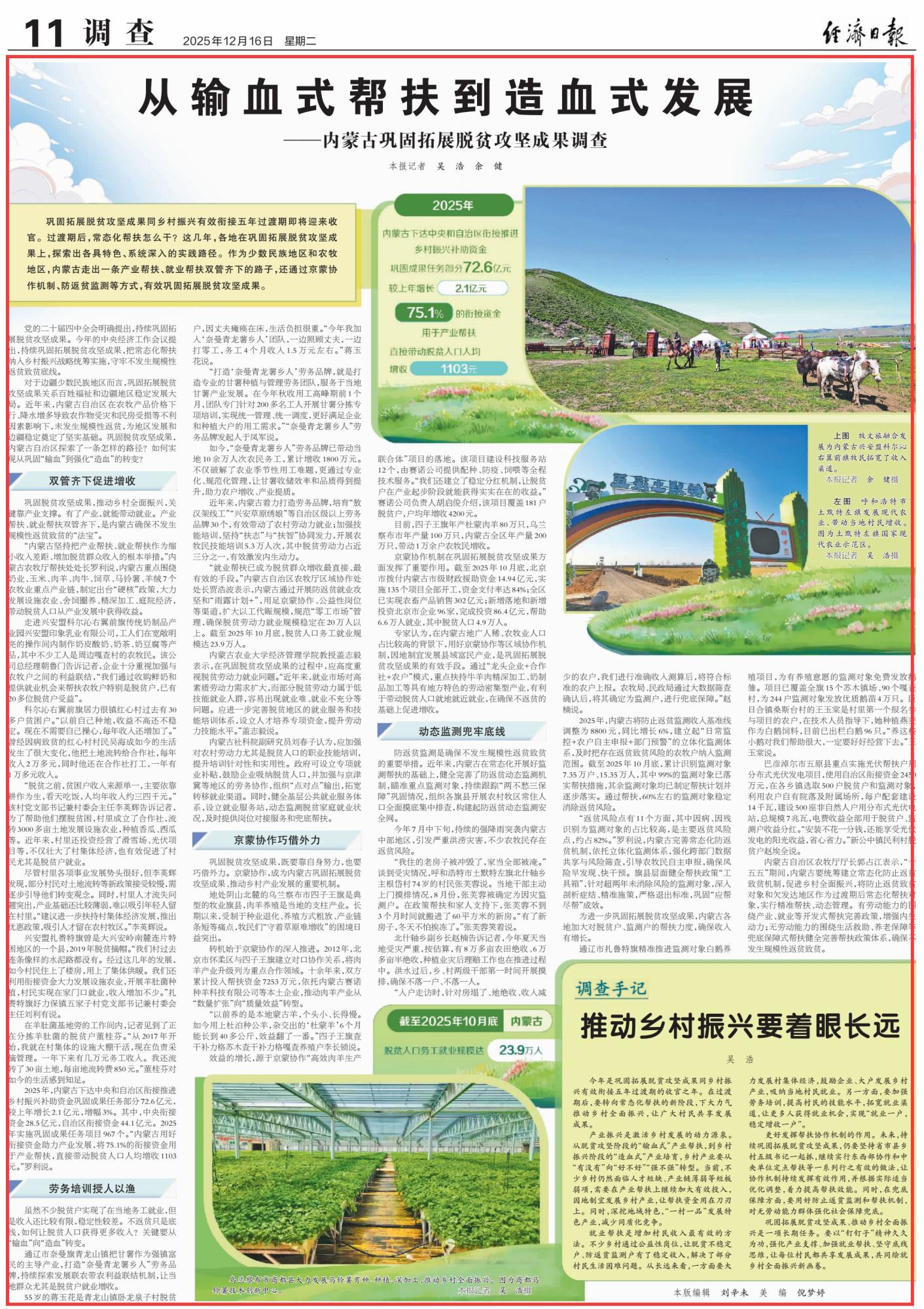 2025年12月16日,《經濟日報》第11版刊發(fā)題為《從輸血式幫扶到造血式發(fā)展——內蒙古鞏固拓展脫貧攻堅成果調查》的文章,報道了鞏固拓展脫貧攻堅成果同鄉(xiāng)村振興有效銜接五年過渡期即將迎來收官。作為少數(shù)民族地區(qū)和農牧地區(qū),內蒙古走出一條產業(yè)幫扶、就業(yè)幫扶雙管齊下的路子,還通過京蒙協(xié)作機制、防返貧監(jiān)測等方式,有效鞏固拓展脫貧攻堅成果。