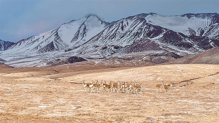 冬日,國(guó)家二級(jí)保護(hù)野生動(dòng)物藏原羚在甘肅省阿克塞縣阿勒騰鄉(xiāng)哈爾騰草原活動(dòng)覓食。新華社發(fā)