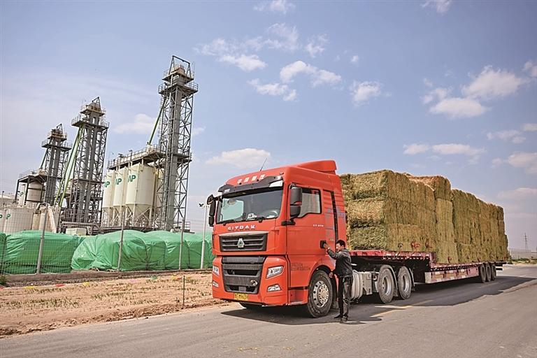 在內(nèi)蒙古赤峰市阿魯科爾沁旗,滿載牧草的貨車準備啟程。新華社發(fā)
