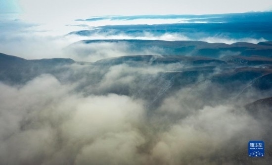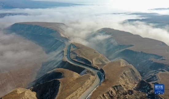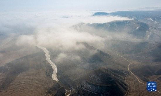 當日,寧夏吳忠市同心縣的山谷間出現(xiàn)云海景觀,農(nóng)田、旱塬、公路在霧中若隱若現(xiàn),景色壯美。