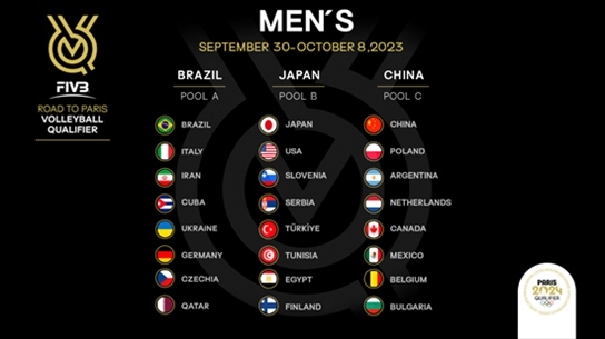男排資格賽將于2023年9月30日至10月8日分別在中國、日本和巴西舉行,分組抽簽規(guī)則與女排相同。經(jīng)過抽簽,A組球隊分別是巴西、意大利、伊朗、古巴、烏克蘭、德國、捷克、卡塔爾;B組為日本、美國、斯洛文尼亞、塞爾維亞、土耳其、突尼斯、埃及、芬蘭;中國與波蘭、阿根廷、荷蘭、加拿大、墨西哥、比利時和保加利亞分在C組。