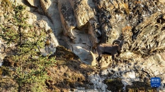 5月11日在內(nèi)蒙古賀蘭山國家級自然保護區(qū)拍攝的巖壁上的巖羊(無人機照片)。