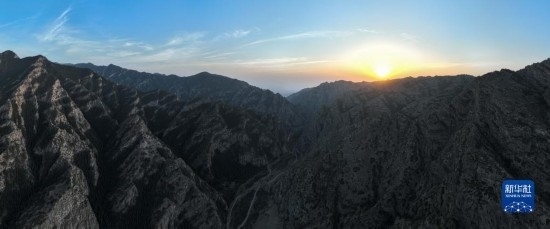日落時分的內(nèi)蒙古賀蘭山國家級自然保護區(qū)(5月11日攝,無人機全景照片)。