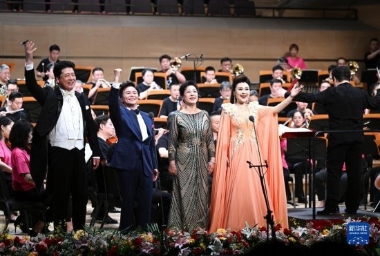 5月25日,在天津大劇院音樂(lè)廳,歌唱家王澤南(左一)、王宏偉(左二)、關(guān)牧村(左三)、張晏蓉等在舞臺(tái)上演出。