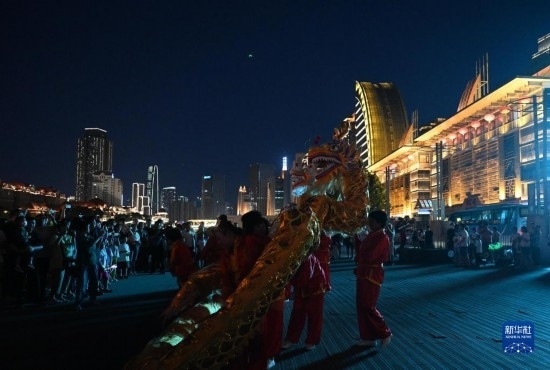 6月22日,人們在天津海河古文化街碼頭附近欣賞舞龍表演。