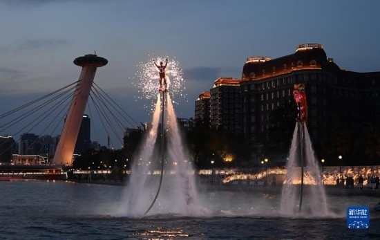 6月22日,一場水上特技表演在天津海河赤峰橋附近舉行。