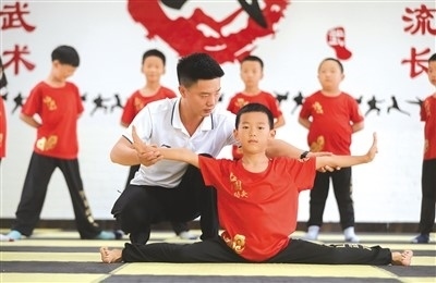暑假期間,貴州省貴陽市開陽縣青少年學(xué)生校外活動中心免費開辦少兒武術(shù)班,吸引當(dāng)?shù)貝酆梦湫g(shù)的孩子參加學(xué)習(xí)。圖為7月18日,在少兒武術(shù)班,孩子們在老師的指導(dǎo)下練習(xí)武術(shù)動作。袁福洪攝(人民圖片)