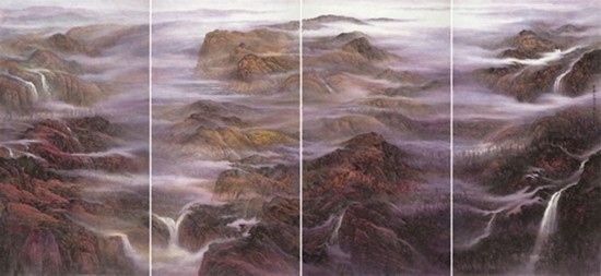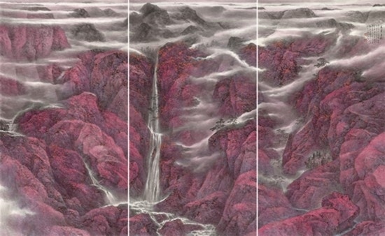 且看樂震文的《直上浮云》《云卷云舒》和《黃土馳風(fēng),日月星辰》,那逶迤茫茫的群山峻嶺,那縱橫畫面的云蒸霞蔚,那連綿不絕的箭樓城堞,哪里還是傳統(tǒng)文人山水畫的淡煙輕嵐,縹緲冷逸?濃縮于畫內(nèi)的精神意蘊(yùn),分明凸顯了現(xiàn)代山水畫對(duì)家國(guó)情懷的抒發(fā)。且讀張弛的《云起疊嶂》《惟余莽莽》和《紫氣氤氳》,那天光紫氣的浩渺煙云,那渾然一體的山水氣象,那千回百轉(zhuǎn)的流水飛泉,其實(shí)早已脫離了對(duì)自然山水的寫照,而是她感悟的時(shí)代精神在偌大畫面上的縱橫揮寫、主觀臆造。