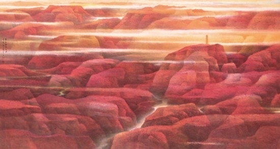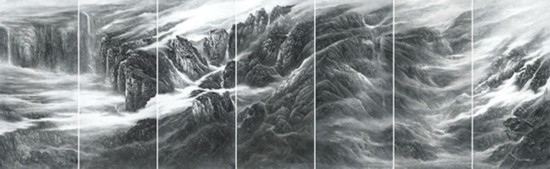 來(lái)自上海并深受海派畫學(xué)影響的樂震文、張弛,在宋元及明清山水畫學(xué)上打下了深厚的功底,也因此,他們的傳統(tǒng)山水畫深受日本民眾的歡迎。他們?cè)尉訓(xùn)|瀛多年,轉(zhuǎn)道再度研習(xí)了中國(guó)傳統(tǒng)文人畫。但真正改變他們畫風(fēng)的,卻是他們對(duì)中國(guó)北方大山大水的寫生攬勝。他們鐘情于英雄的太行山,忘情于革命勝地陜北高原,力求通過(guò)壯闊雄渾的山巒、連綿逶迤的群峰來(lái)表達(dá)他們的時(shí)代感悟,營(yíng)構(gòu)儲(chǔ)存于他們胸中的山川氣象。所謂“山河回聲”,正是這些作品抒發(fā)的中華民族歷經(jīng)歲月風(fēng)華在大好河山之中回響的奮斗激情。