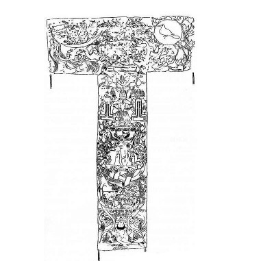 需要指出的是,這一進(jìn)程和墓主人辛追靈魂升仙的進(jìn)程是同步的。馬王堆漢墓T形帛畫的構(gòu)圖和漢代畫像石天界、人間、地下世界的三段模式非常近似,所以很多學(xué)者據(jù)此將T形帛畫也劃分為天界、人間、地下三部分。但這種看法我不贊成。我比較贊同T形帛畫的主題是引魂升天的主張。日本京都大學(xué)教授曾部川寬對漢代靈魂升仙的主題有非常深入的研究。1981年他出版的《向昆侖山升仙——古代中國人描繪的死后世界》(《崑崙山への昇仙——古代中國人が描いた死後の世界》)中,指出這幅非衣的主題就是升仙主題。整幅T形帛畫描述的是墓主人辛追升仙的進(jìn)程。從下到上,T形帛畫中央整個(gè)中軸貫穿著的是一個(gè)升騰的主題。陰陽兩條龍自下而上在中央部分穿璧而過,托舉起魂車?;贶嚿系暮诵娜宋锿ǔUJ(rèn)為就是墓主人辛追。按照這一解釋,中間部分描繪的并不是我們生活的人間,而是從地下向天界升騰的墓主人辛追不斷升向仙界的魂魄。畫面上她的魂魄正被二龍牽引的魂車引向天門。從時(shí)間上說,辛追的魂魄將要進(jìn)入的,同樣是由死亡而再生的進(jìn)程。
