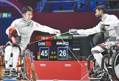 杭州亞殘運會輪椅擊劍男子花劍團體金牌賽,中國體育代表團運動員孫剛(左)與伊拉克體育代表團運動員友好示意。本報記者 王 亮攝
