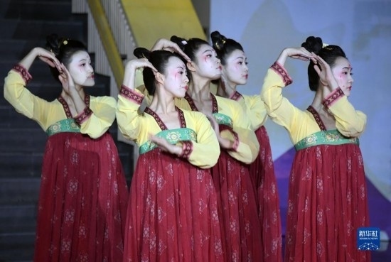 12月4日,在清華大學(xué)藝術(shù)博物館,來自北京師范大學(xué)的學(xué)生表演舞蹈《宮樂圖》。
