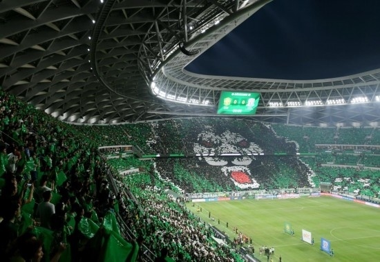 8月19日,球迷在現(xiàn)場擺出北京國安隊(duì)的雄獅圖案。新華社記者 張晨霖 攝