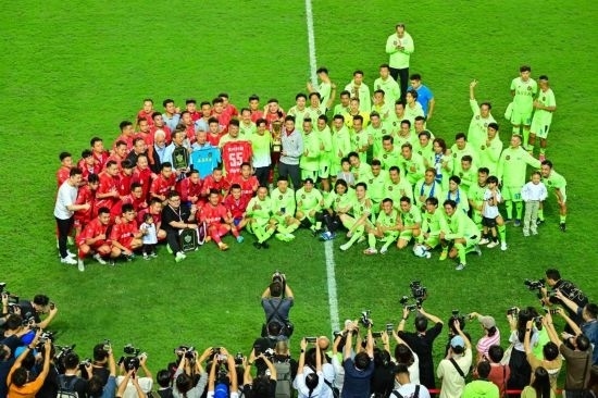 11月11日,貴州榕江“村超”聯(lián)隊(duì)與香港明星足球隊(duì)在比賽后合影。新華社記者 朱煒 攝