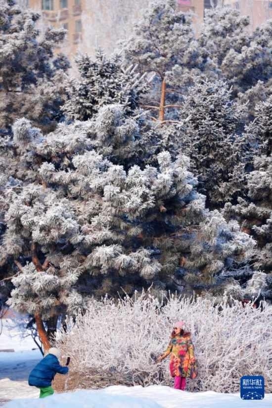 當(dāng)日,降雪后的冰城哈爾濱市出現(xiàn)霧凇景觀,大地銀裝素裹,玉樹(shù)瓊枝美如畫(huà)卷。