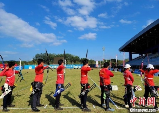 國家體育訓(xùn)練南方基地(海南白沙·綜合),國家射箭隊紅隊在進行一場隊內(nèi)賽。 中新網(wǎng)記者 王曉斌 攝