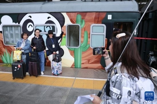5月8日,旅客在“熊貓專列”前拍照留念。