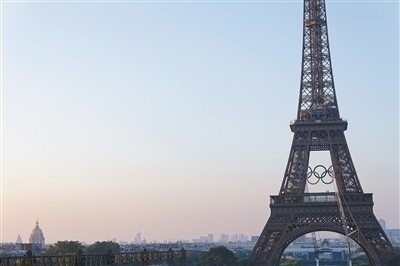 奧運五環(huán)安裝在巴黎地標(biāo)性建筑埃菲爾鐵塔上。圖片來源:巴黎奧運會官網(wǎng)