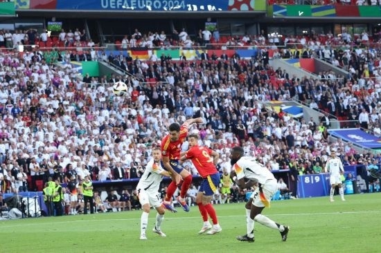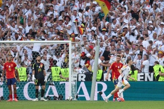 久攻之下,德國(guó)隊(duì)終于在第89分鐘扳平比分,米特爾施泰特左路傳中,基米希頭球回?cái)[,維爾茨抽射入網(wǎng)。兩隊(duì)在常規(guī)時(shí)間1:1戰(zhàn)平,比賽進(jìn)入加時(shí)賽。第106分鐘,德國(guó)隊(duì)穆夏拉射門(mén)擊中西班牙隊(duì)庫(kù)庫(kù)雷利亞手臂,后者當(dāng)時(shí)在本方禁區(qū)內(nèi)防守,但主裁判并沒(méi)有判罰點(diǎn)球,VAR(視頻助理裁判)也沒(méi)有介入。
